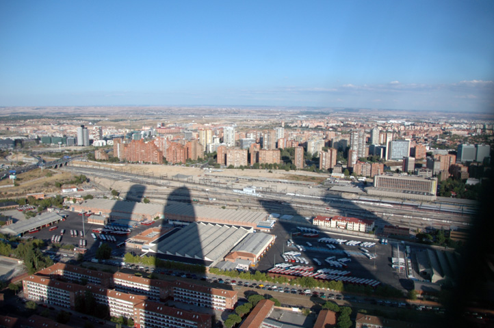 La sombra de las 4 torres de la Ciudad Deportiva del Real Madrid se proyecta sobre las cocheras de la EMT y la zona de una hipotética ampliación de la Castellana siguiendo las vías de Renfe.