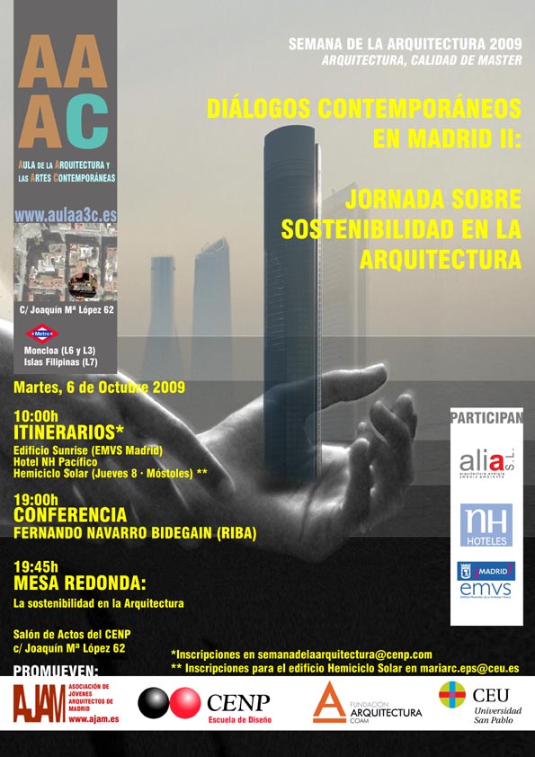 Así, se plantea realizar una conferencia de D Fernando Navarro Bidegain (Arquitecto miembro del Royal Institute of British Architects (RIBA) y Arquitecto Fundador de la Comisión de medio ambiente del Consejo Superior de Colegios de Arquitectos de España.) que introduzca el problema a la que seguirá una mesa redonda en las que estén presentes los promotores tanto de ámbito privado como el público, así como aquellos diseñadores que han hecho de la Eficiencia Energética un hecho diferencial en su trabajo.