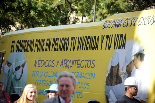 La pasada semana, el mismo día que se aprobaba este real decreto, tuvo lugar la manifestación inédita de Médicos y Arquitectos contra la actual aplicación de Bolonia. Nos dejó algunas imágenes curiosas. Aprovechamos el tirón del Halloween para mostrar alguna (estas chicas han creado escuela):